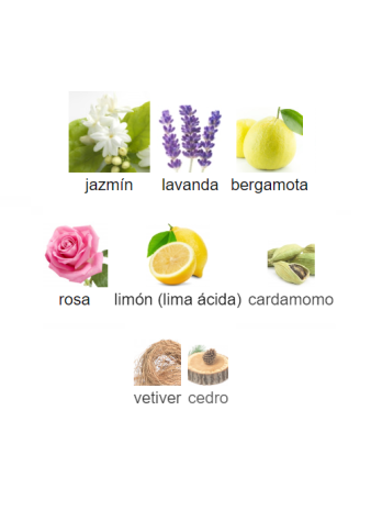 Notas altas: cardamomo, cedro, romero, pomelo. Notas medias: ylang-ylang, incienso, nardos. Notas de fondo: cedro, sándalo, vetiver.