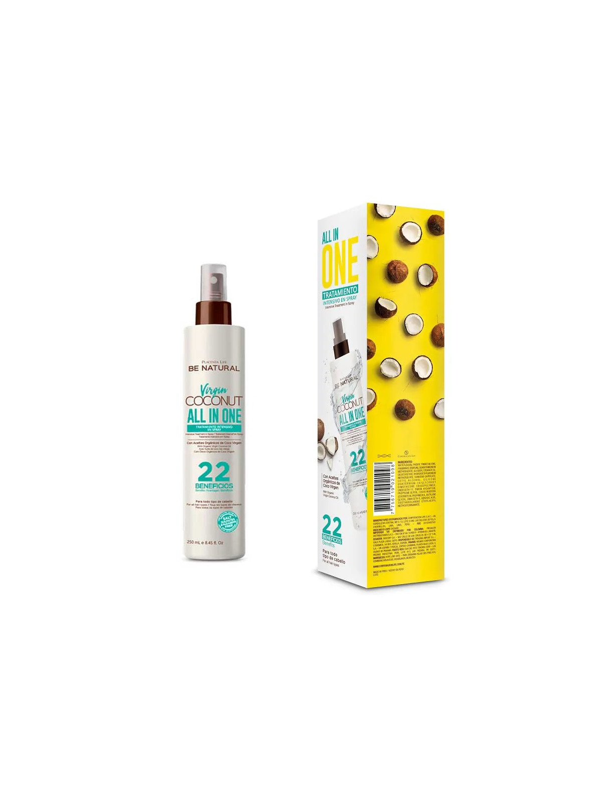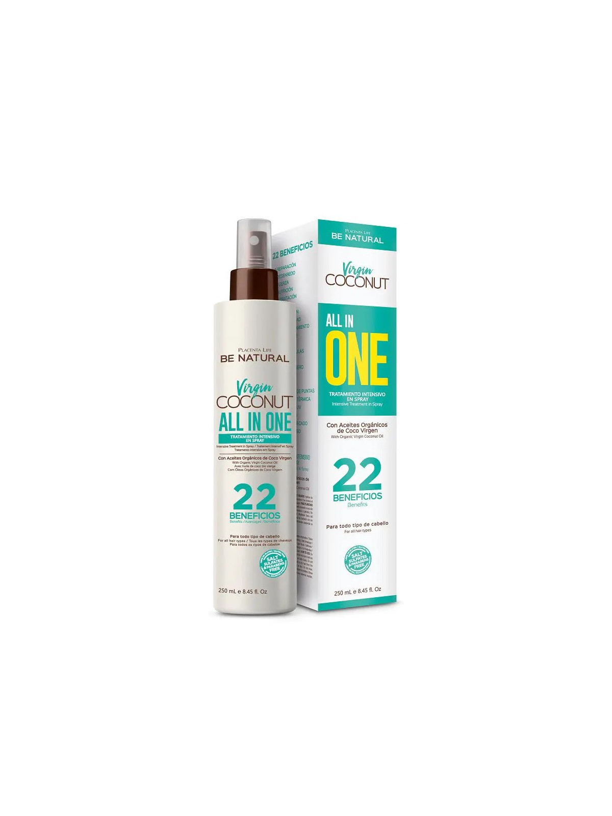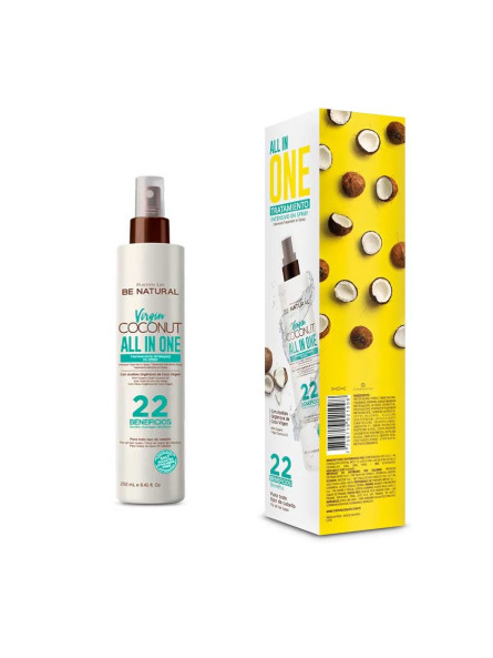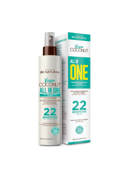 Tratamiento Intensivo en Spray All in One Virgin Coconut es un acondicionador líquido sin aclarado con 22 beneficios: reparación, desenredo, fuerza, nutrición, hidratación, brillo, humectación, manejabilidad, acondicionamiento, anti-rotura, anti encrespamiento, sella cutículas, revitalizante, acabado ligero, suavidad, aporta textura, protege las puntas, protección térmica, protección UV, peinabilidad, facilita el secado, cabello sedoso.