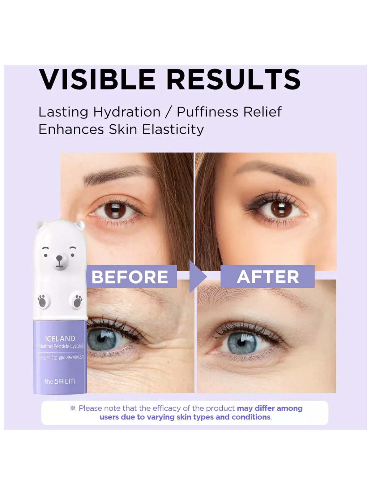 Stick para ojos hidratante con péptidos de The Saem que nutre, hidrata y suaviza el contorno de los ojos. Aporta una sensación ligera y refrescante a tu piel a la vez que reduce la aparición de arrugas y líneas de expresión. Gracias al agua glacial islandesa refresca e hidrata la piel mientras que los péptidos estimulan la producción de colágeno a la vez que mejora la elasticidad y firmeza de la piel.