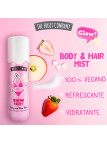 Hidrata y refresca tu piel y cabello con nuestra fórmula vegana y llena de brillo. Disfruta del aroma jugoso de fresas, manzanas y caña de azúcar en cada pulverización.