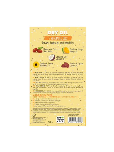 - Aceite Seco con 5 aceites vegetales que reparan, hidratan y embellecen: manteca de karité, aceite de mango, aceite de girasol, acete de coco y aceite de jojoba.