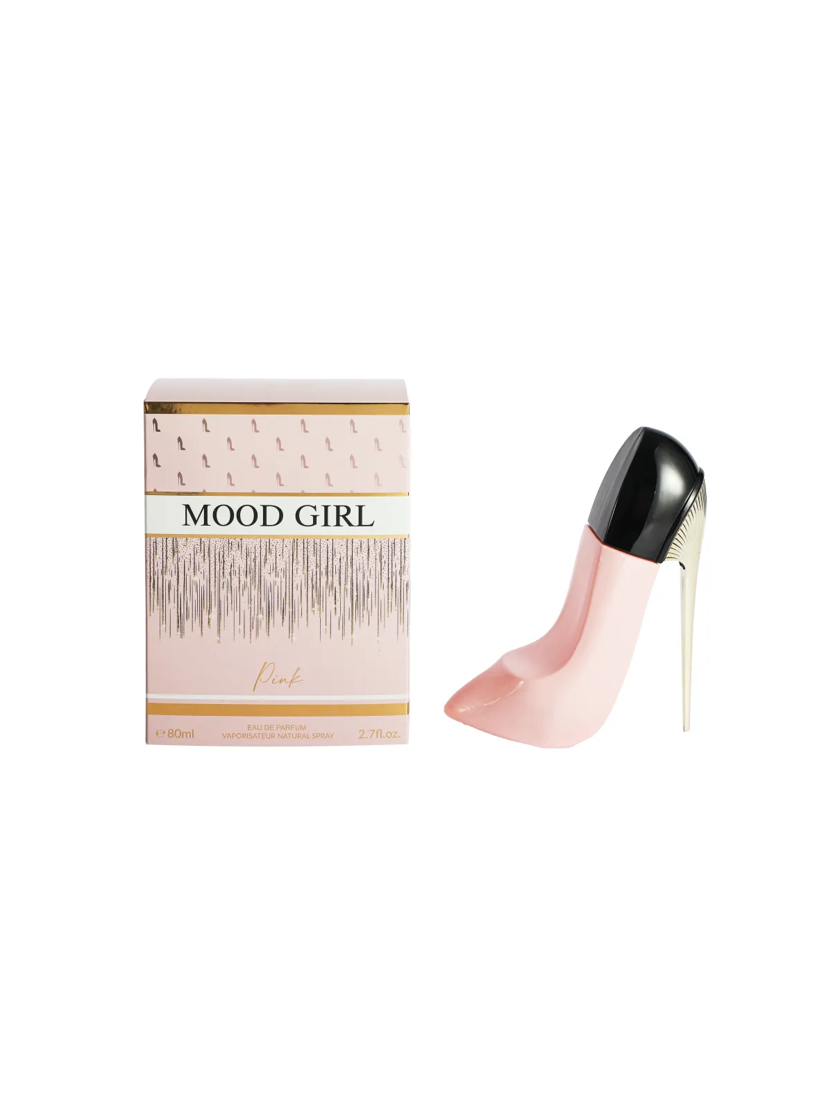 El frasco en forma de tacón alto, con un acabado rosa pastel y detalles dorados, transmite feminidad, glamour y un encanto delicado.