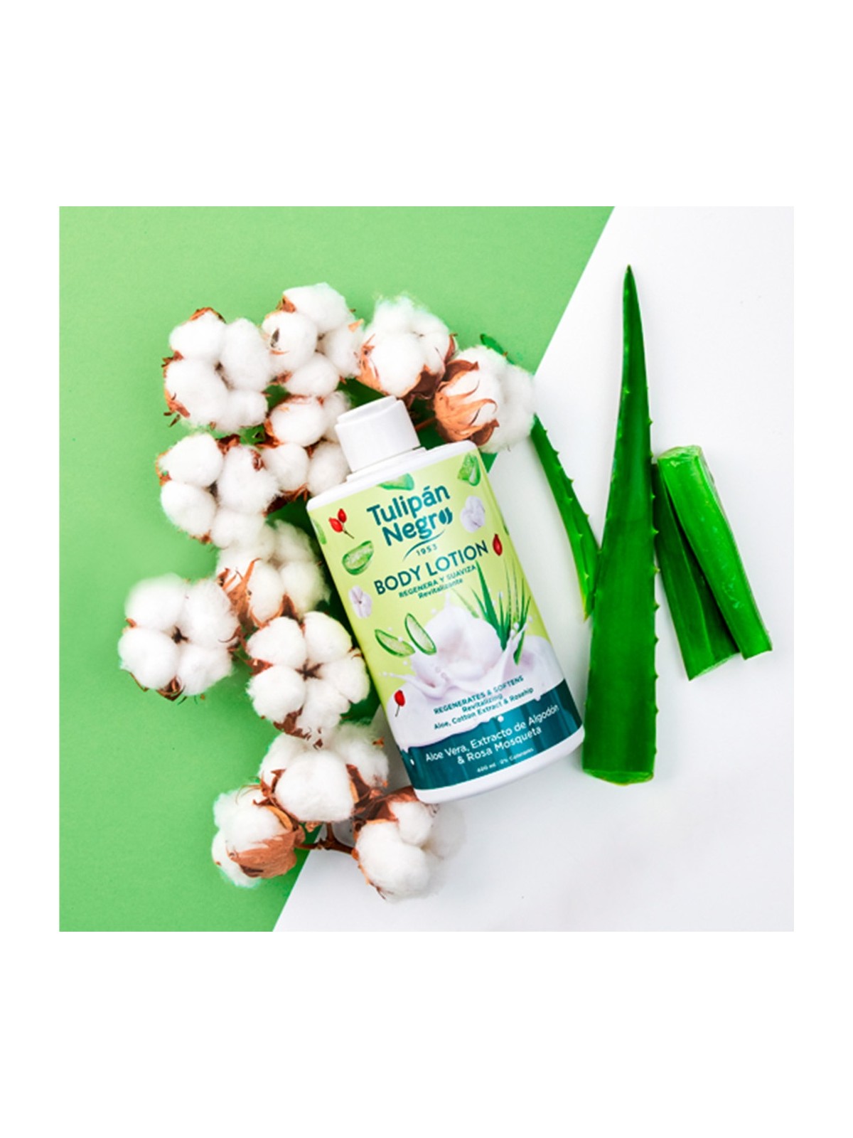 LOCION CORPORAL ALOE VERA, EXTRACTO ALGODON Y ROSA MOSQUETA 400ML - TULIPAN NEGRO