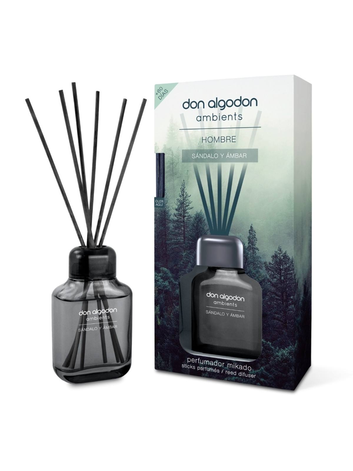 Sumérgete en una experiencia exótica con Mikado Don Algodón Ambients Hombre Sándalo & Ámbar. Este ambientador de 65 ml, elaborado con extractos naturales y sin alcohol, llenará tu espacio con una fragancia ambarada y oriental. Su aroma de acento espaciado y toque floral envolverá tu hogar de una fragancia llena de carácter y calidez