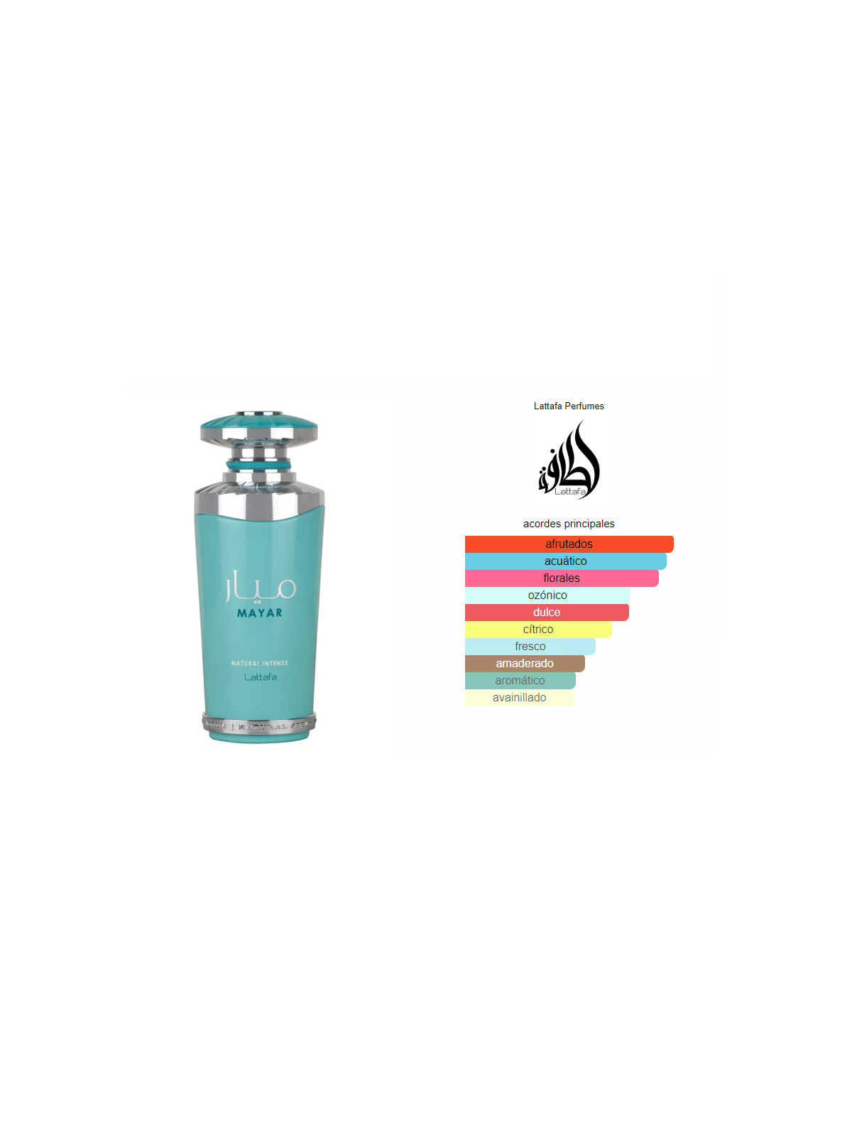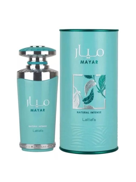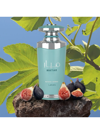 Mayar Natural Intense de Lattafa Perfumes es una fragancia de la familia olfativa para Mujeres. Esta fragrancia es nueva. Mayar Natural Intense se lanzó en 2024. Las Notas de Salida son higo, Mandarina verde, melón y Agua de coco; las Notas de Corazón son flor de loto, nenúfar (lirio de agua) y jazmín; las Notas de Fondo son vainilla, sándalo, ambroxan y almizcle.