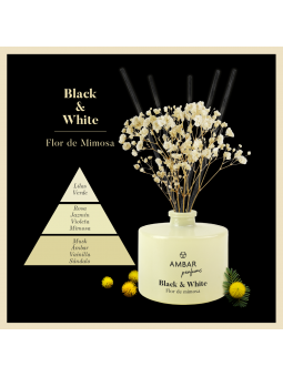 Mikado Flor de Mimosa Black & White El mikado Flor de Mimosa de la colección Black & White te transporta a un jardín en flor con su fragancia sofisticada y reconfortante. Sus notas de salida de mimosa y notas verdes, un corazón de jazmín, y un fondo suave de musk crean una combinación...