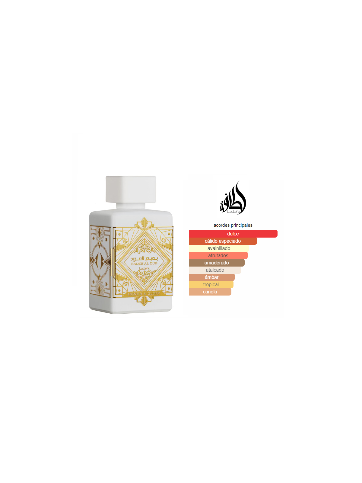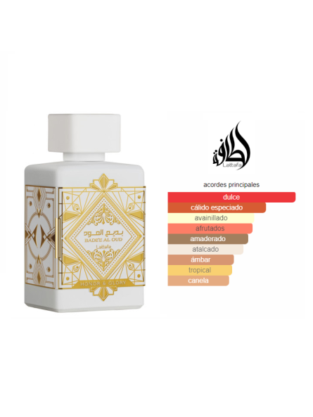Bade'e Al Oud Honor & Glory de Lattafa Perfumes es una fragancia de la familia olfativa para Hombres y Mujeres. Esta fragrancia es nueva. Bade'e Al Oud Honor & Glory se lanzó en 2023. Las Notas de Salida son piña y créme brulée; las Notas de Corazón son canela, benjuí, cúrcuma (azafrán de la India) y pimienta negra; las Notas de Fondo son vainilla, cachemira, sándalo y musgo.