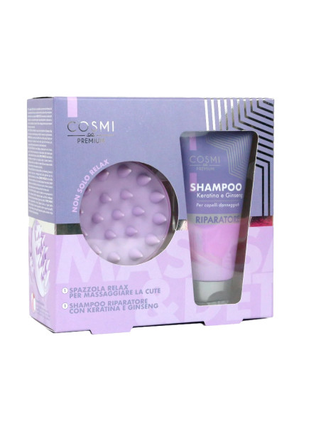 SET DE CHAMPU REPARADOR KERATINA GINSENG + CEPILLO PARA CUERO CUERO Y CABELLO - COSMI